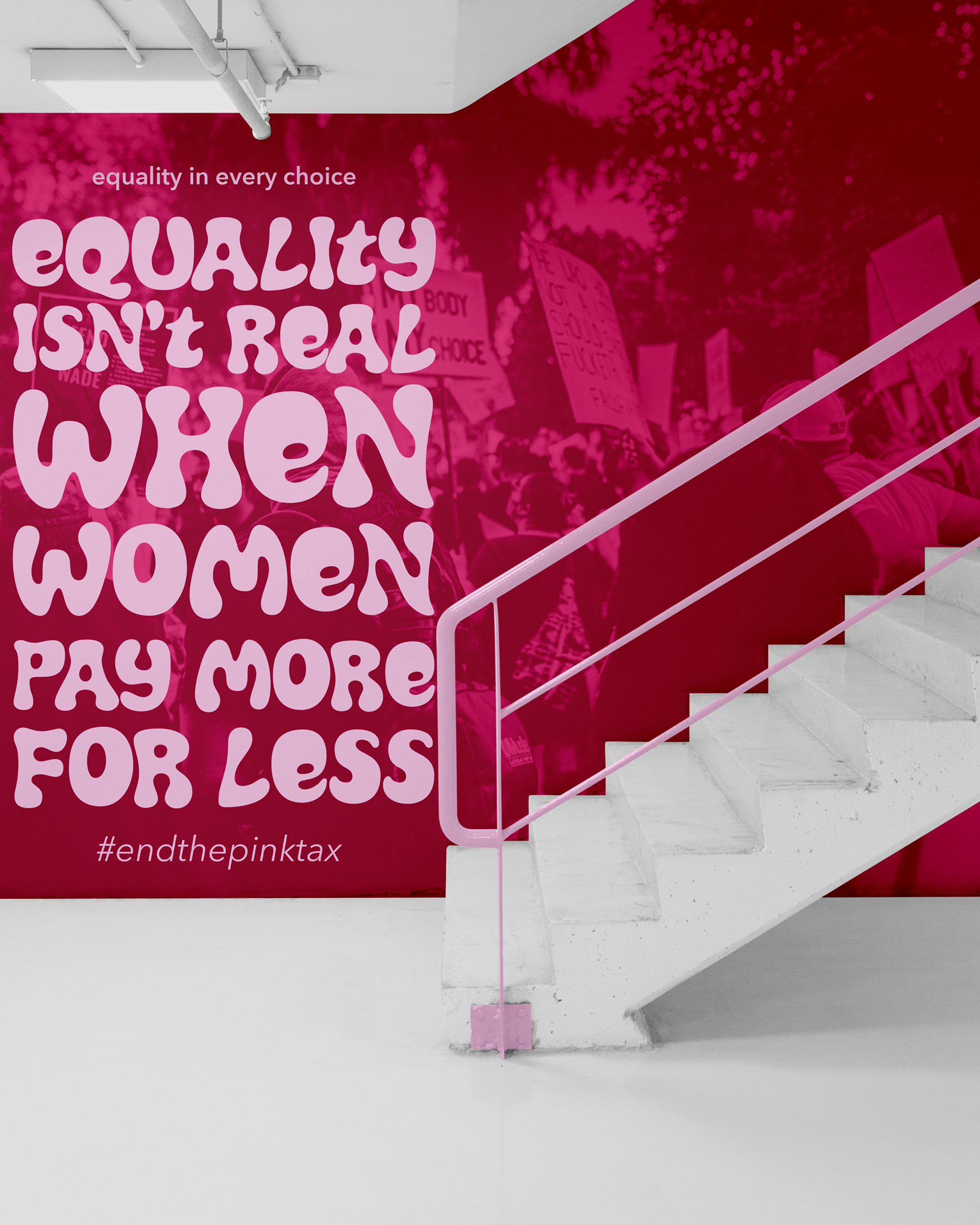 Equality in Every Choice is a social awareness campaign designed to address systemic issues like Equal Pay, the Pink Tax, and Reproductive Rights. By placing bold visuals in everyday public spaces, the campaign encourages people to reflect on how these issues impact their daily lives. The goal is to spark conversation and advocate for gender equity through accessible and engaging design.